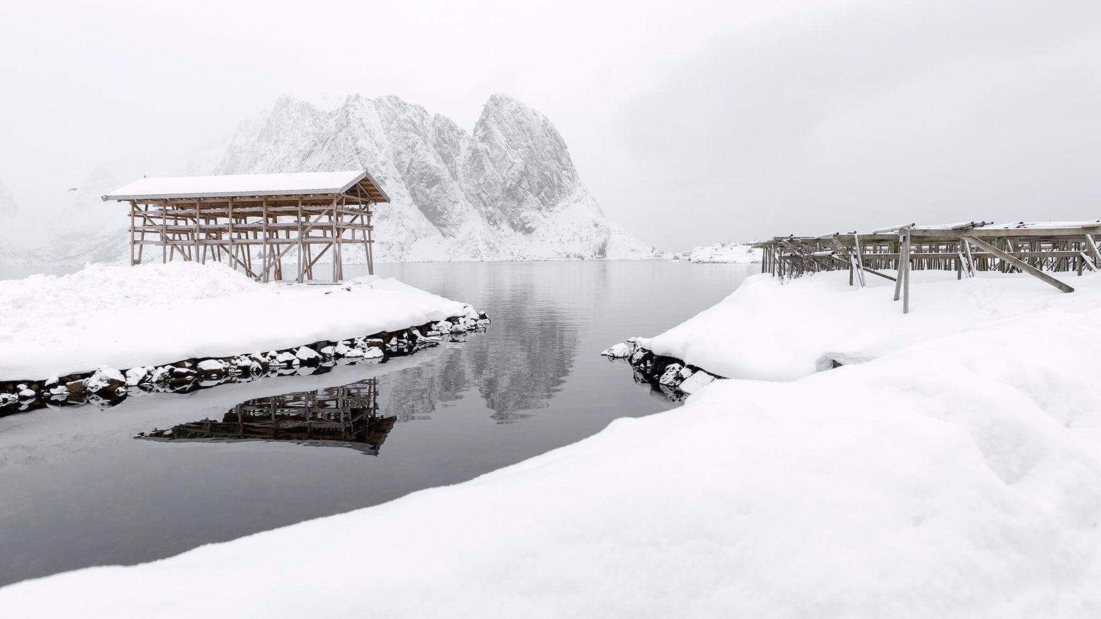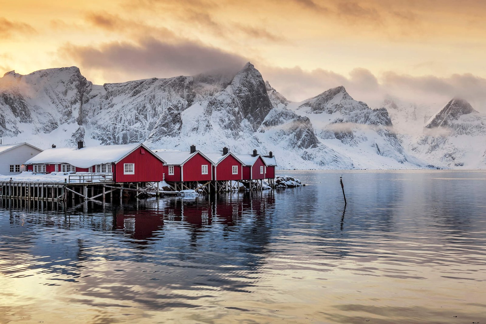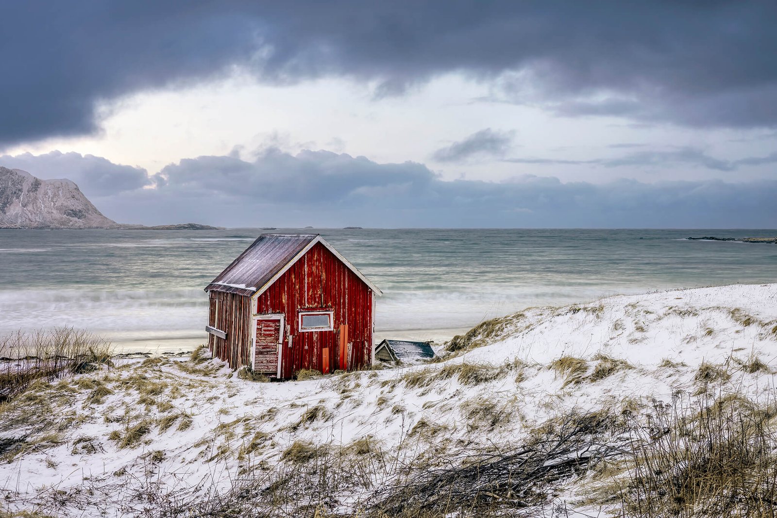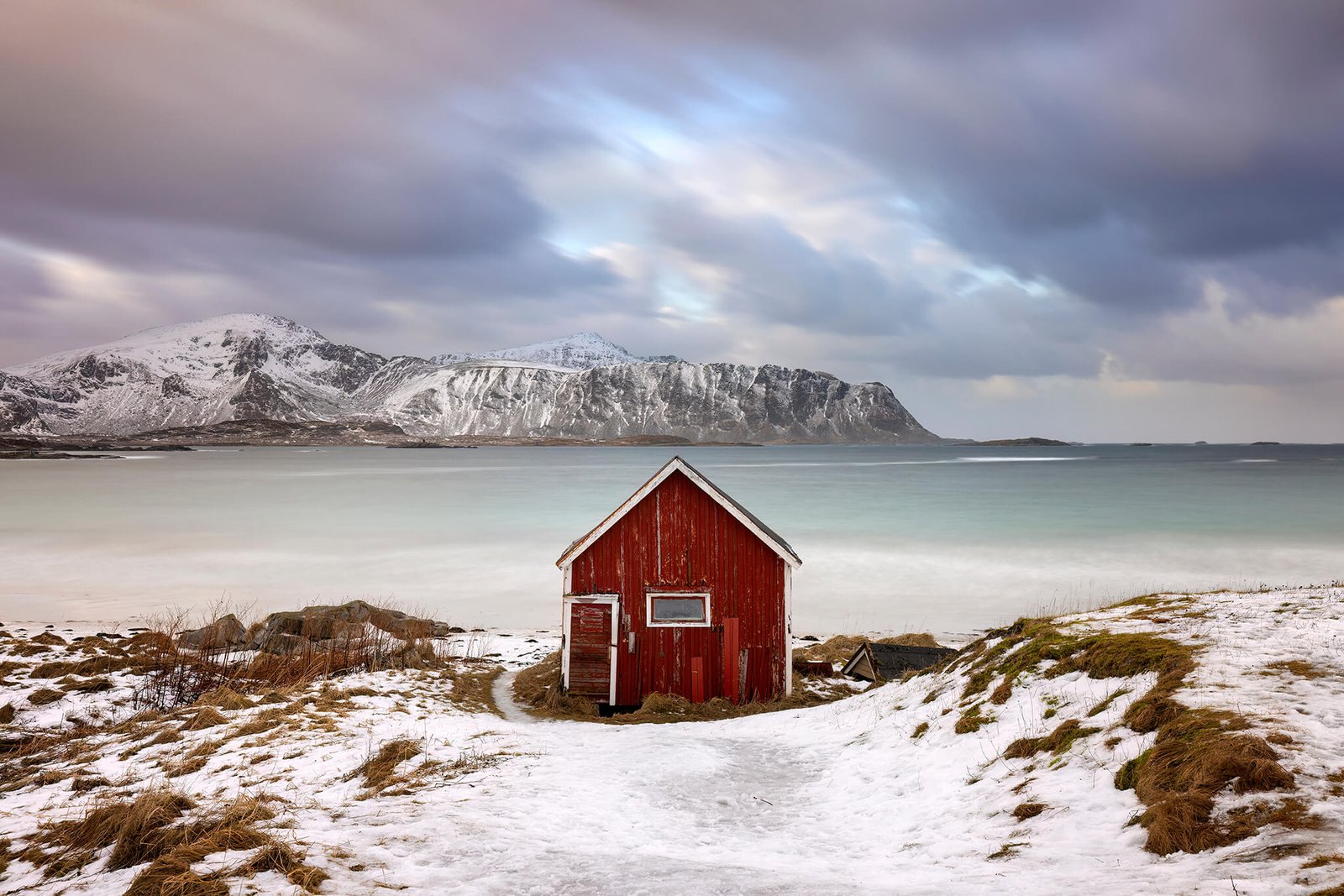 Lofoten's winter transformation creates unparalleled photographic opportunities. The iconic red rorbuer (traditional fishermen's cabins) provide vibrant focal points against the monochromatic winter landscape, while the interconnected islands linked by dramatic bridges offer endless compositional possibilities. Snow blankets the entire region, creating a pristine winter wonderland that enhances every photographic element.