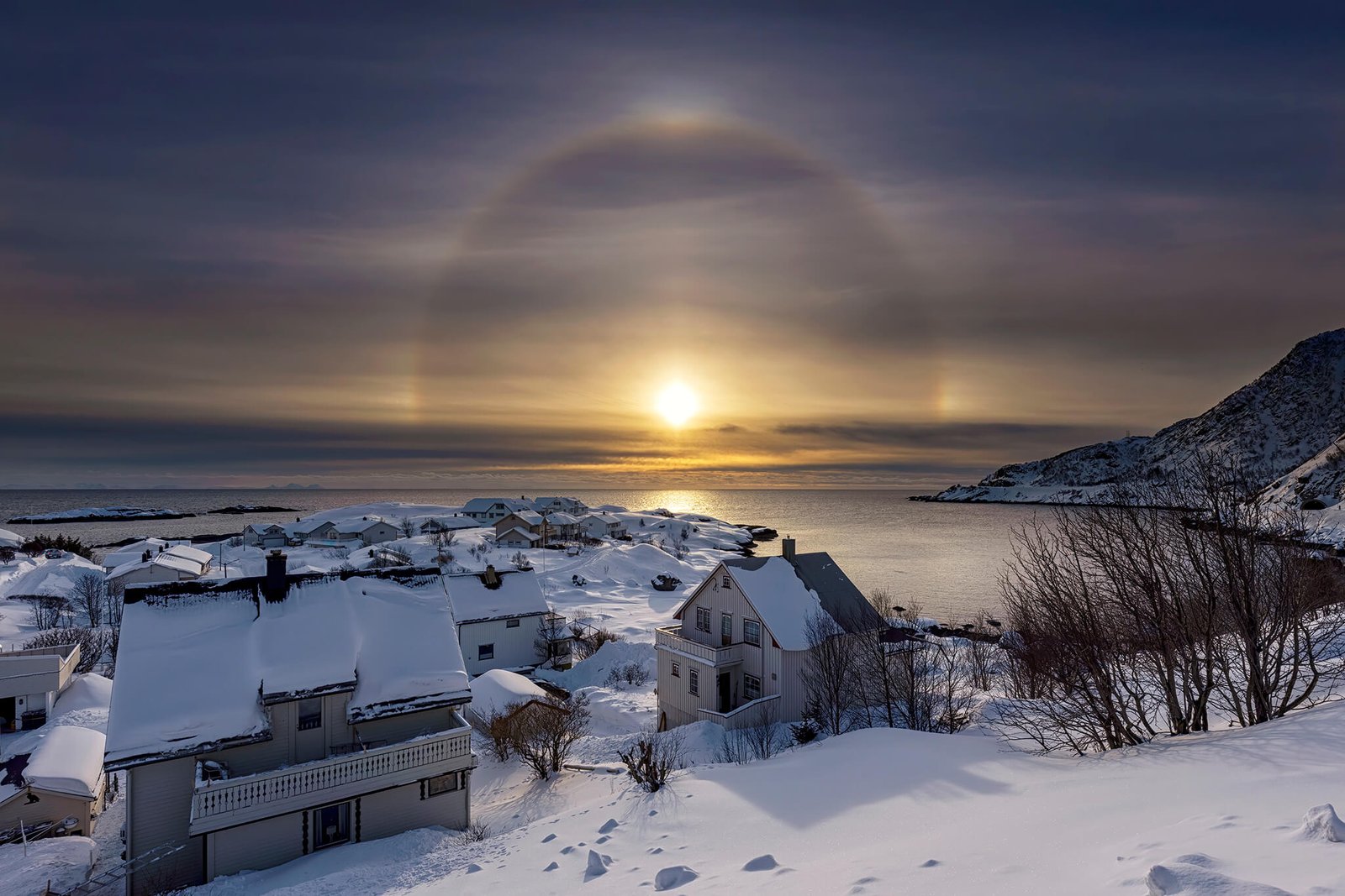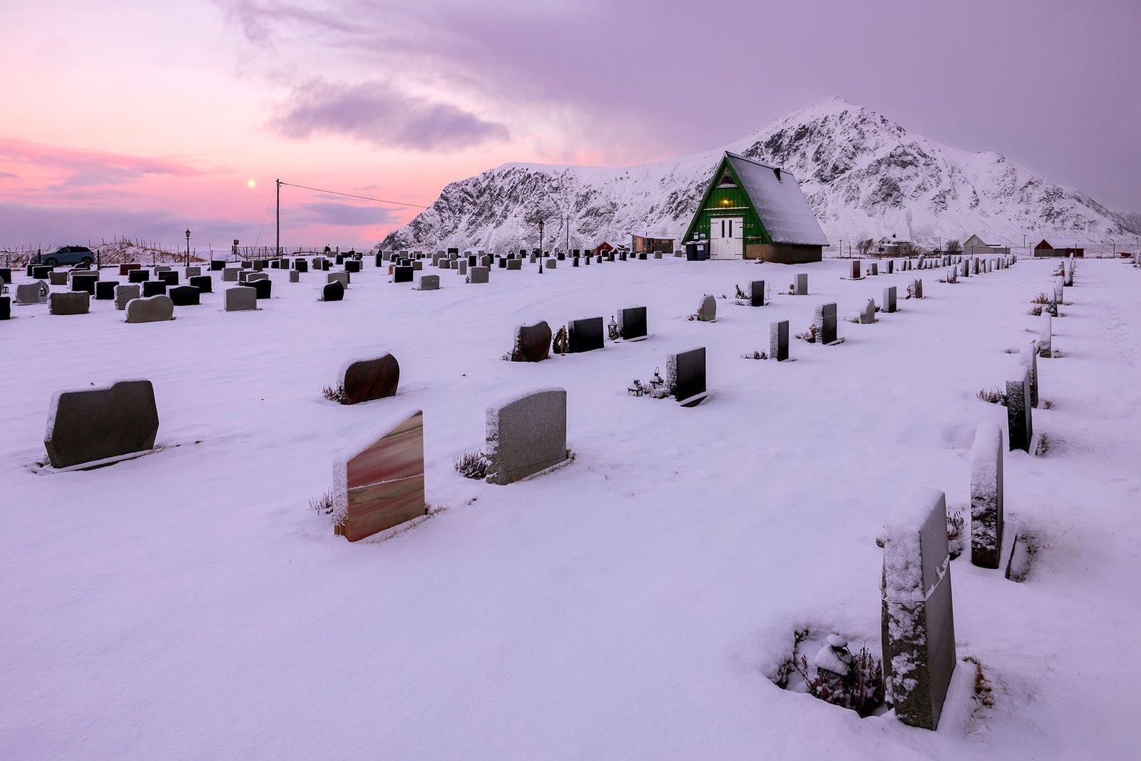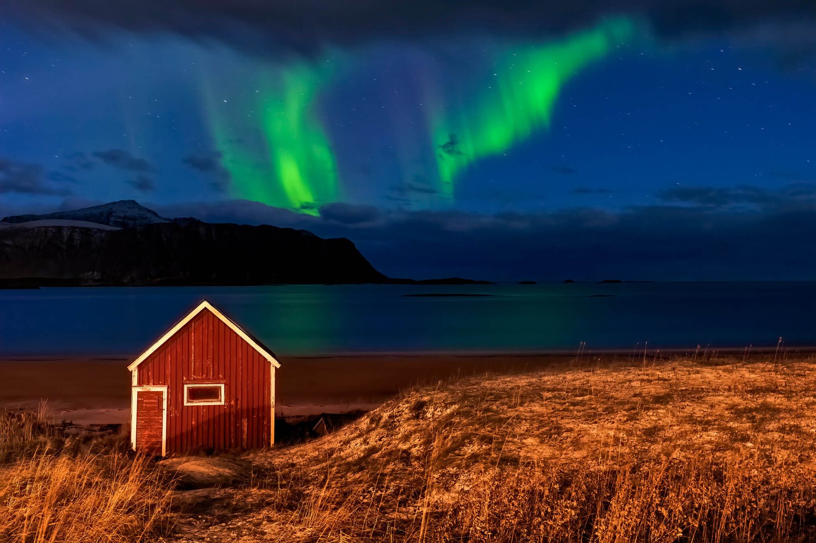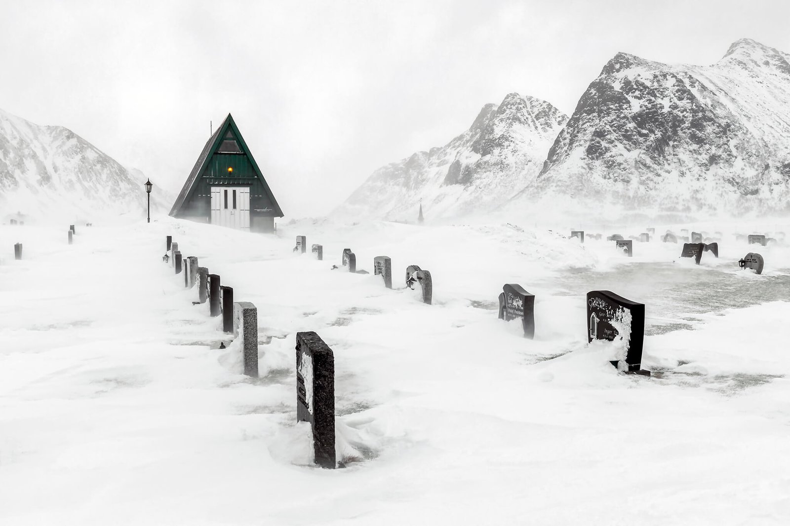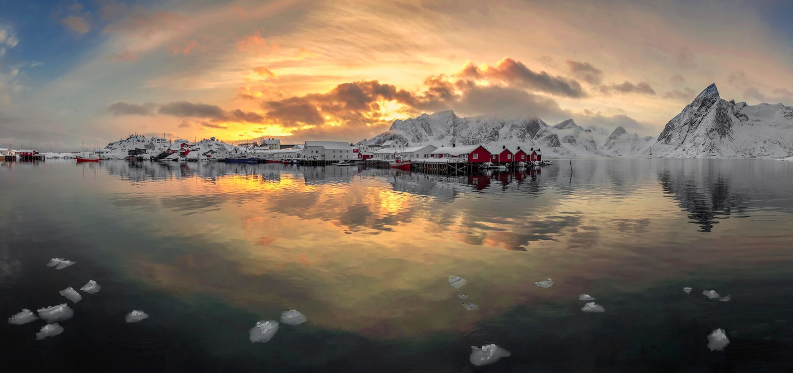 Lofoten's winter transformation creates unparalleled photographic opportunities. The iconic red rorbuer (traditional fishermen's cabins) provide vibrant focal points against the monochromatic winter landscape, while the interconnected islands linked by dramatic bridges offer endless compositional possibilities. Snow blankets the entire region, creating a pristine winter wonderland that enhances every photographic element.