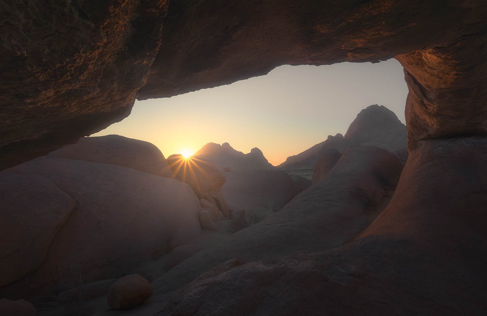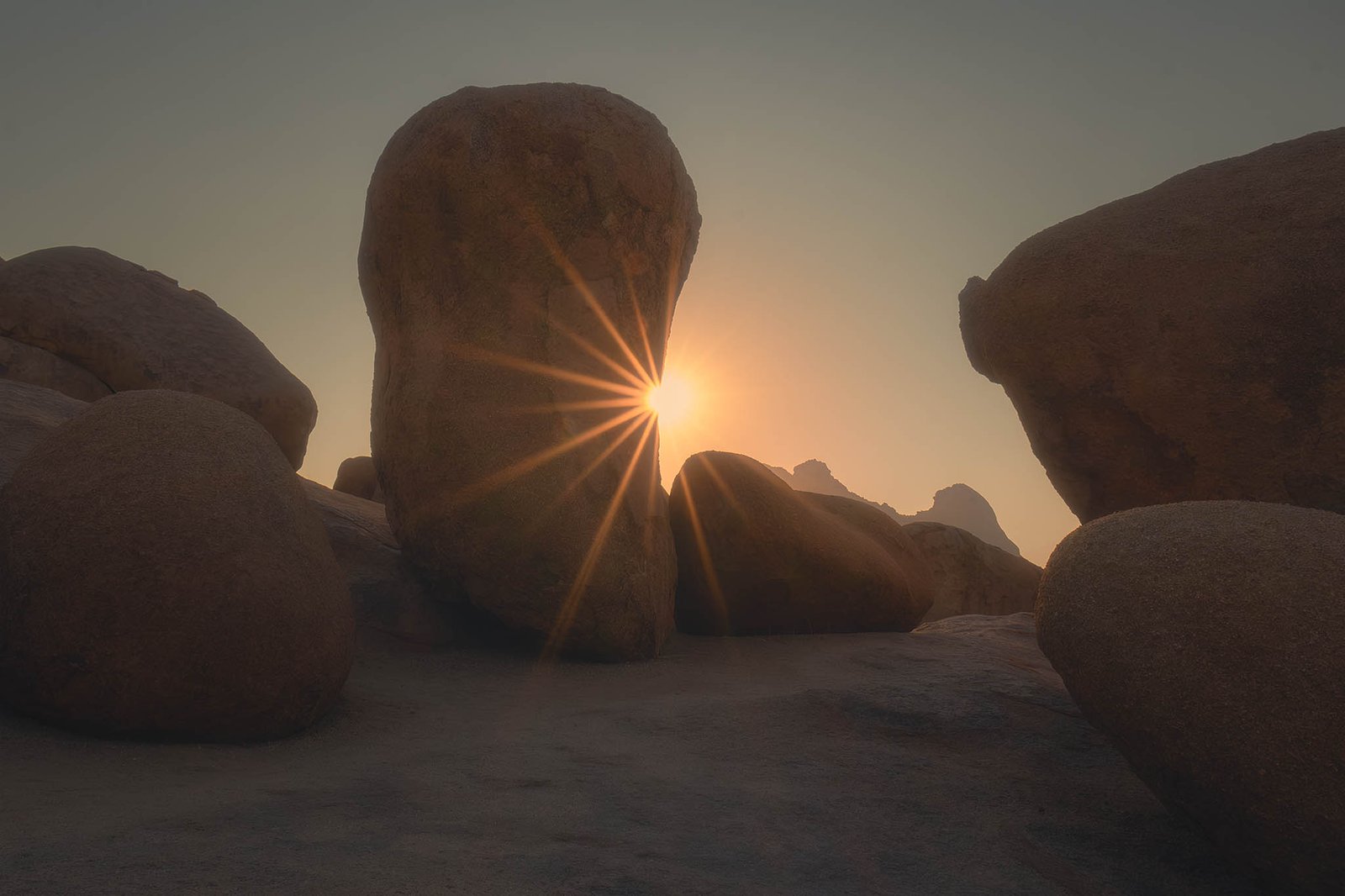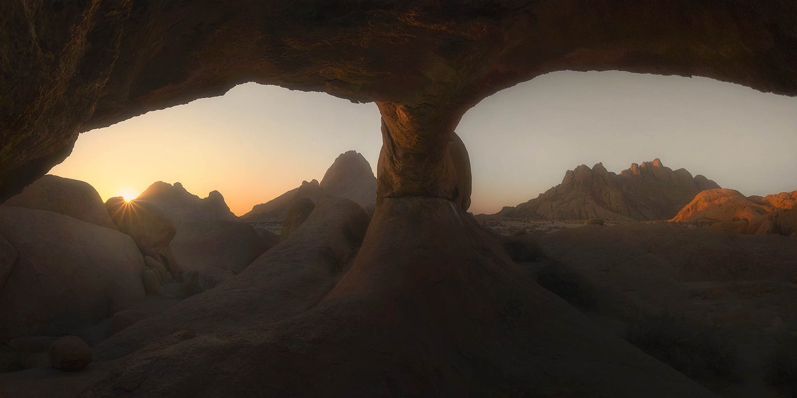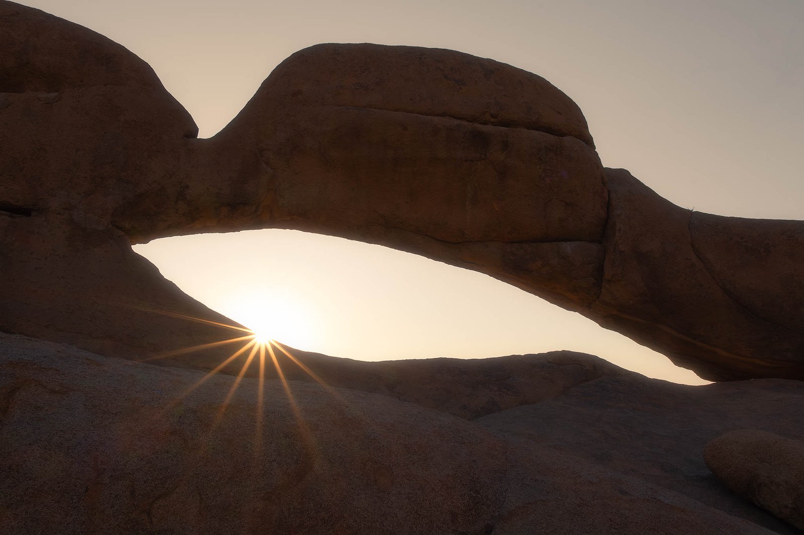 The rugged granite monoliths of Spitzkoppe rise from the desert floor like ancient sentinels, their weathered surfaces and distinctive rock arch formations offering compelling subjects for both sunrise and sunset photography.